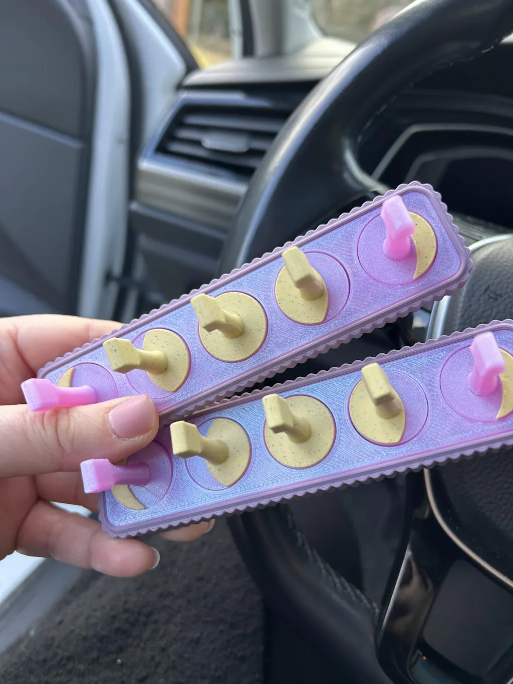 These moon phase (waxing crescent, waxing gibbous, full moon, waning gibbous, waning crescent how is that for some science?) stands come as two units of five stands with base. Strong, fully-embedded 8x3 mm magnets in the stands and 6x2mm fully-embedded magnets in the base provide a very robust platform for working on your acrylic nails and a rainbow of available color combinations allow you to finally match your aesthetic to your kit! Printed in PLA (various brands per colors needed) on Bambu Lab printers.